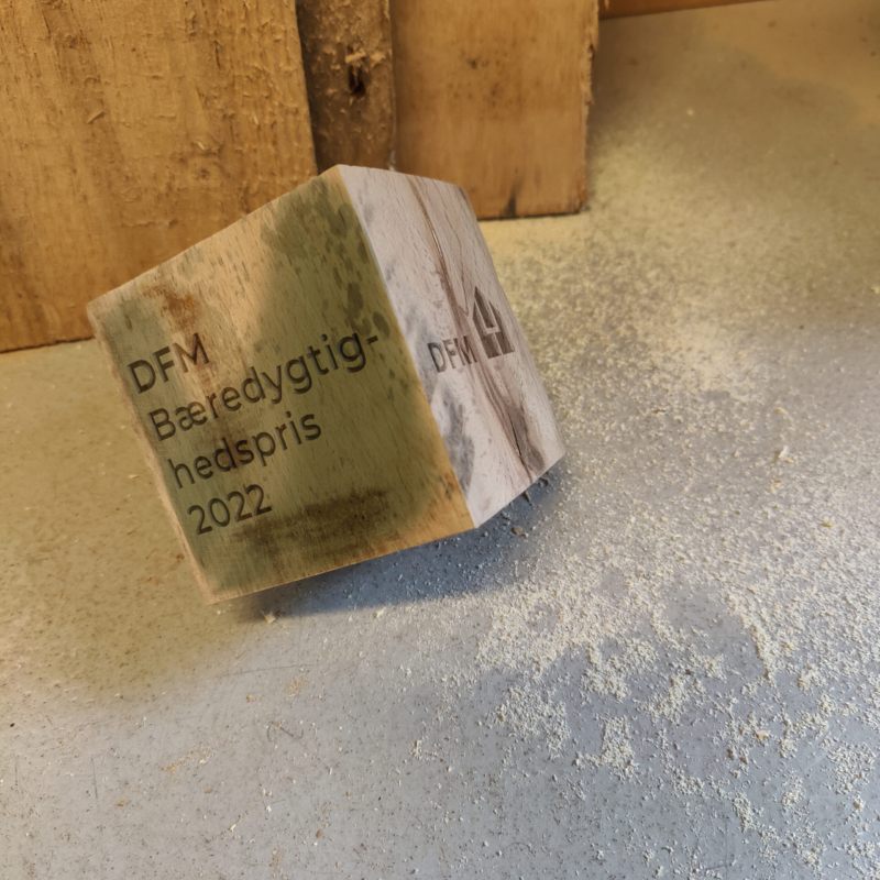“Den lænende” er et unikt trofæ med autentisk karakter. Lavet af genbrugstræ i form af gamle bøgestave, hver træblok bærer historien om sit tidligere liv, hvor den er blevet brugt i forbindelse med fragt at stålprofiler, hvilket betyder der vil kunne forekomme brugstegn i træet i form af buler og variation i træet farve.